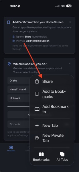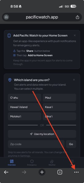 Pacific Watch works as a Progressive Web App (PWA). Add it to your home screen for an app-like experience with push notifications for severe weather alerts.